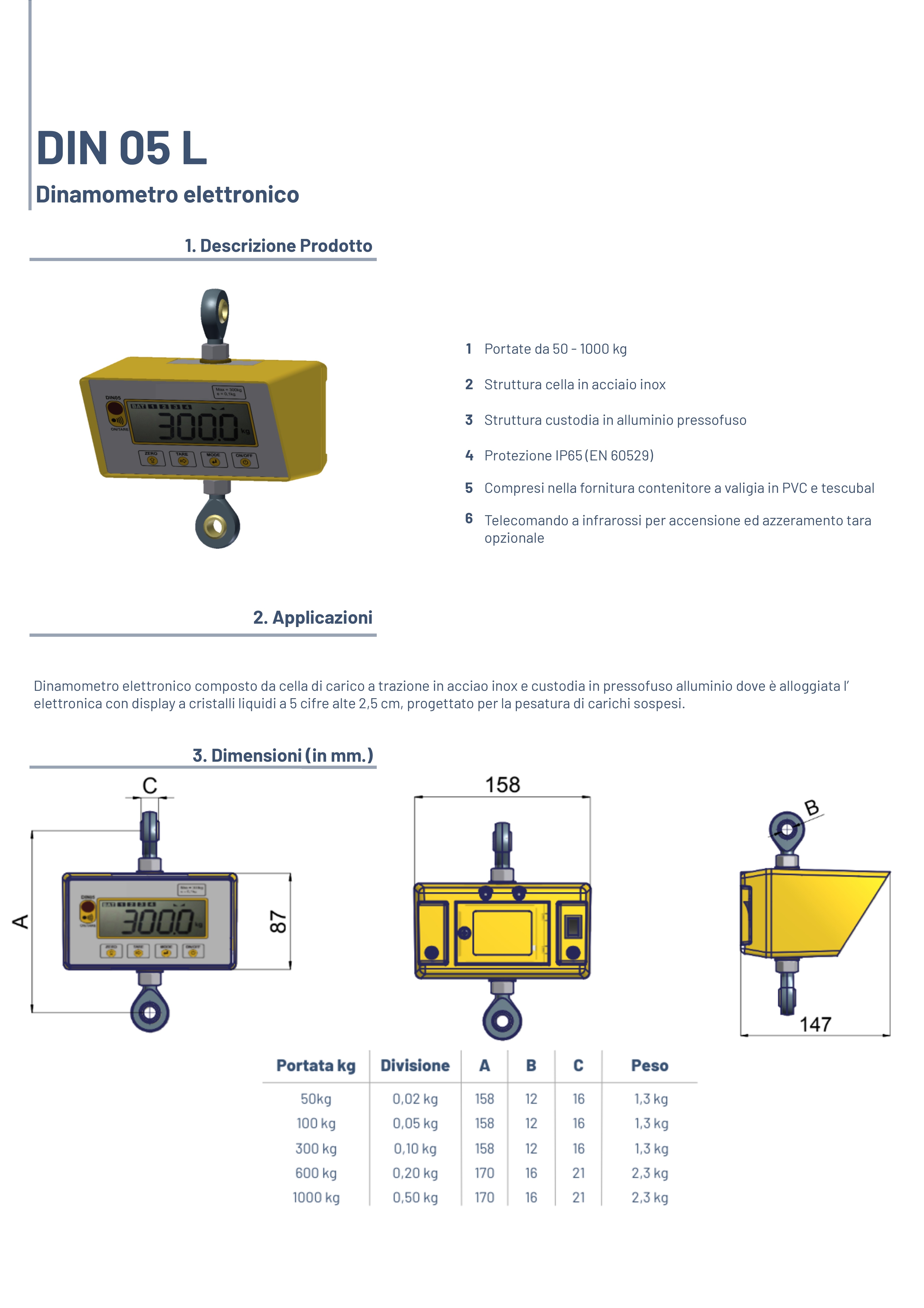 electronic dynamometer composed by a stainless steel traction load cell and an aluminium housing where is placed an electronic with a liquid crystal display 5 digit h=2,5, designed for weighing suspended loads. functions are provided for: digital zero and weight settings, digital filter selection (greater attenuation of weight oscillations), automatic power-off selection, peak function and hold function and measuring units selection (kg – n – kn - lb).