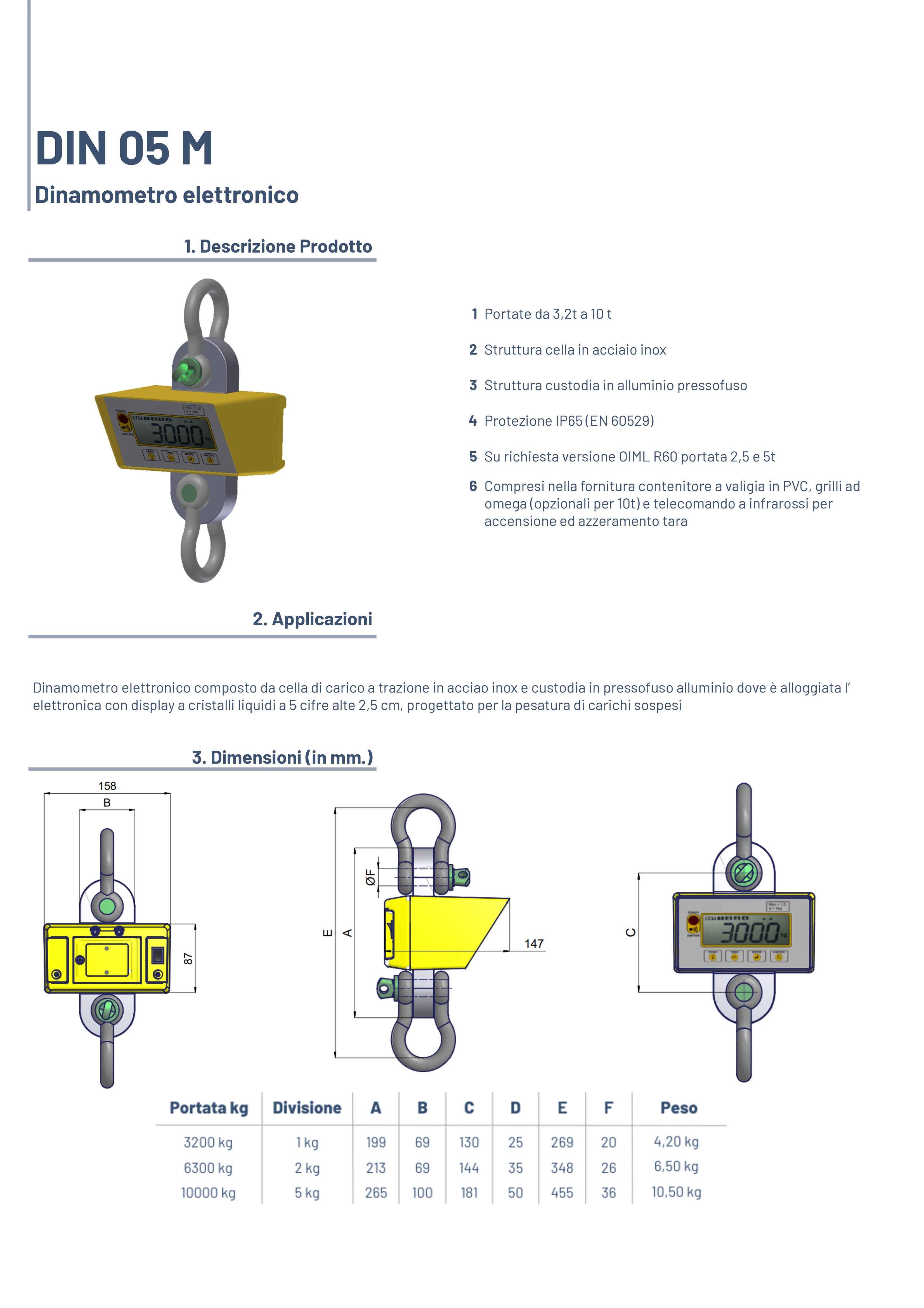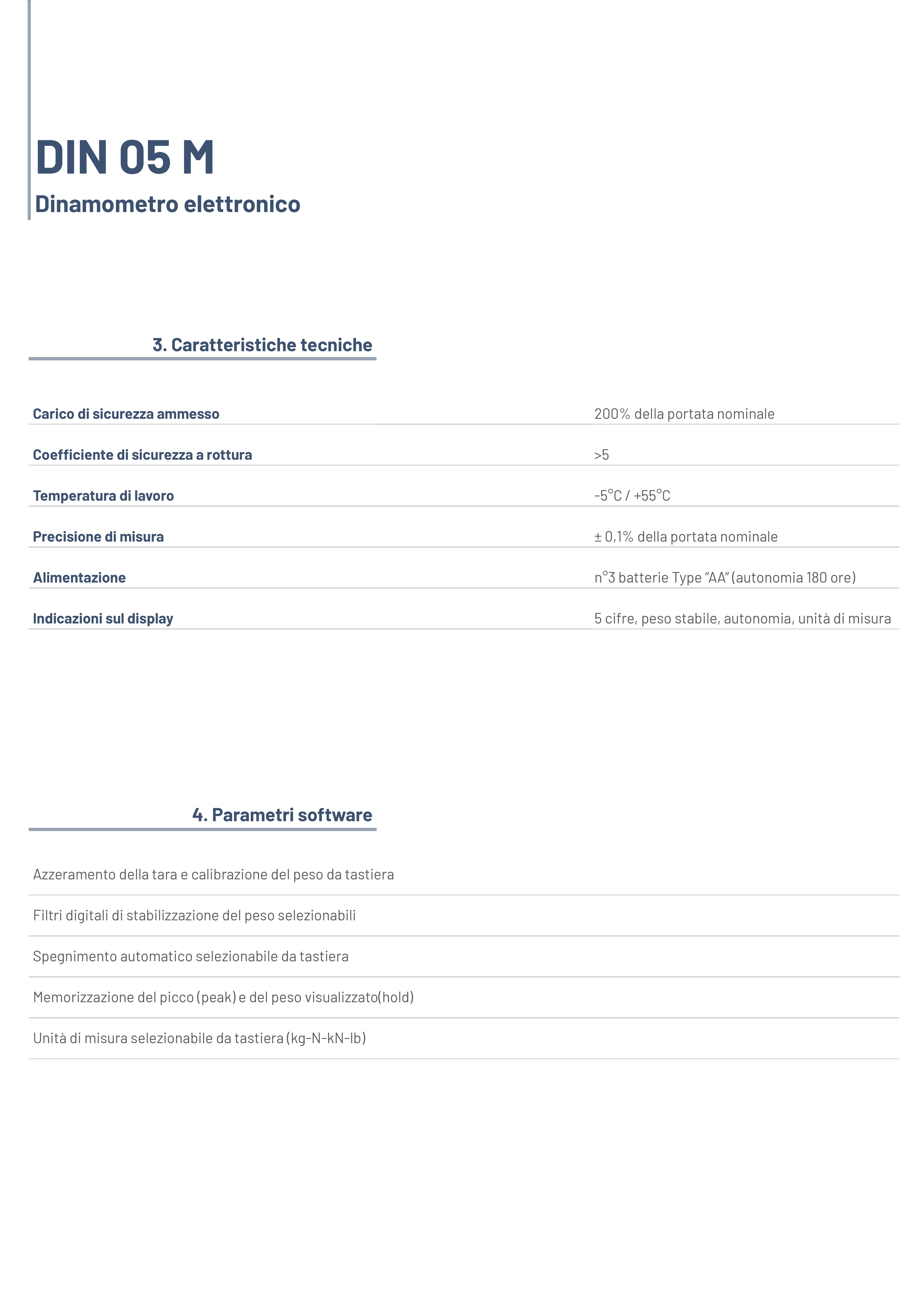 electronic dynamometer composed by a stainless steel traction load cell and an aluminium housing where is placed an electronic with a liquid crystal display 5 digit h=2,5, designed for weighing suspended loads. functions are provided for: digital zero and weight settings, digital filter selection (greater attenuation of weight oscillations), automatic power-off selection, peak function and hold function and measuring units selection (kg – n – kn - lb).