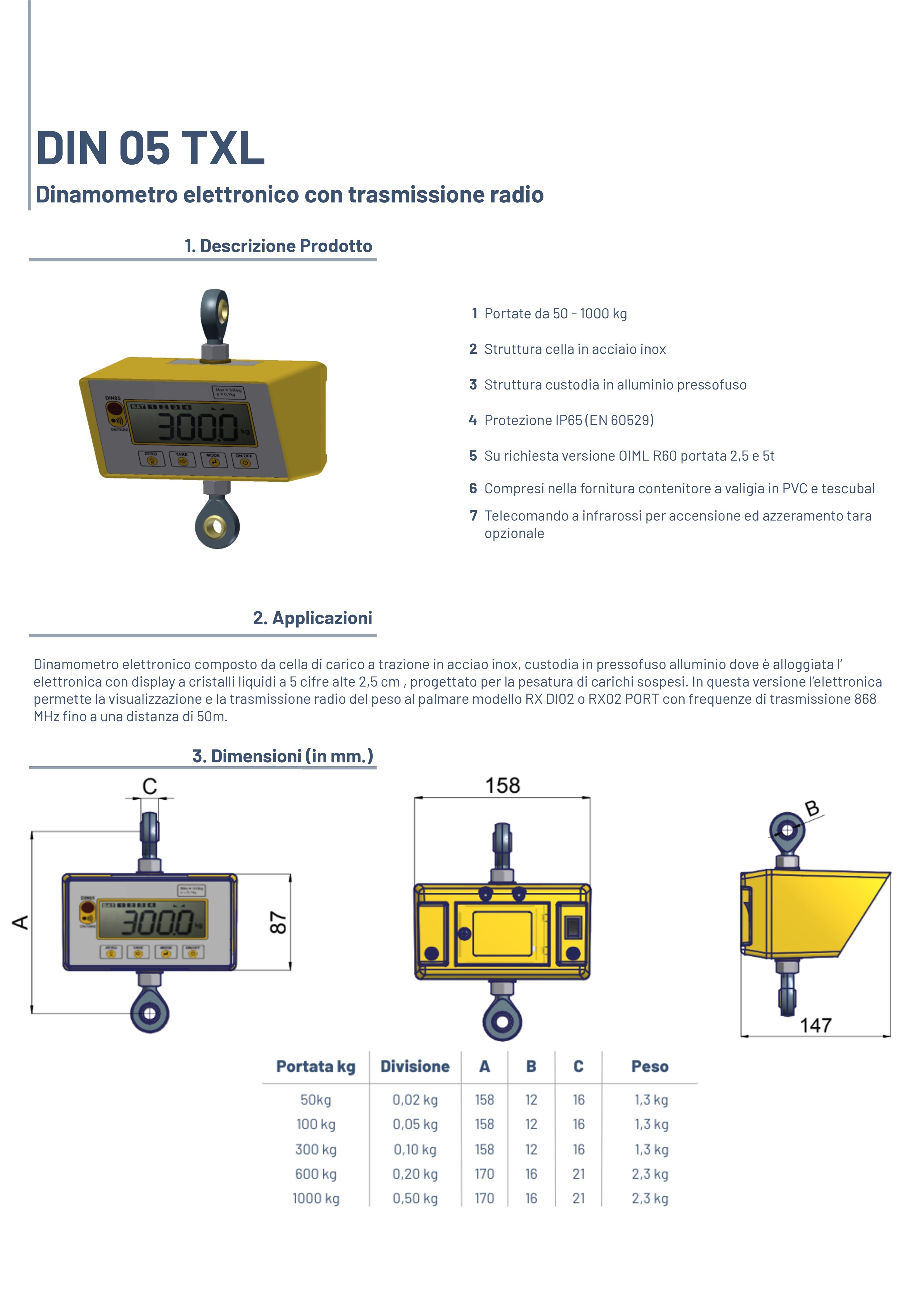 electronic dynamometer composed by a stainless steel traction load cell and an aluminium housing where is placed an electronic with a liquid crystal display 5 digit h=2,5, designed for weighing suspended loads with radio transmission to the hand receiver instrument model rx di02 or rx02 port with transmission frequencies 868 mhz up to a distance of 50 meters . functions are provided for: digital zero and weight settings, digital filter selection (greater attenuation of weight oscillations), automatic power-off selection, peak function and hold function and measuring units selection (kg – n – kn - lb).