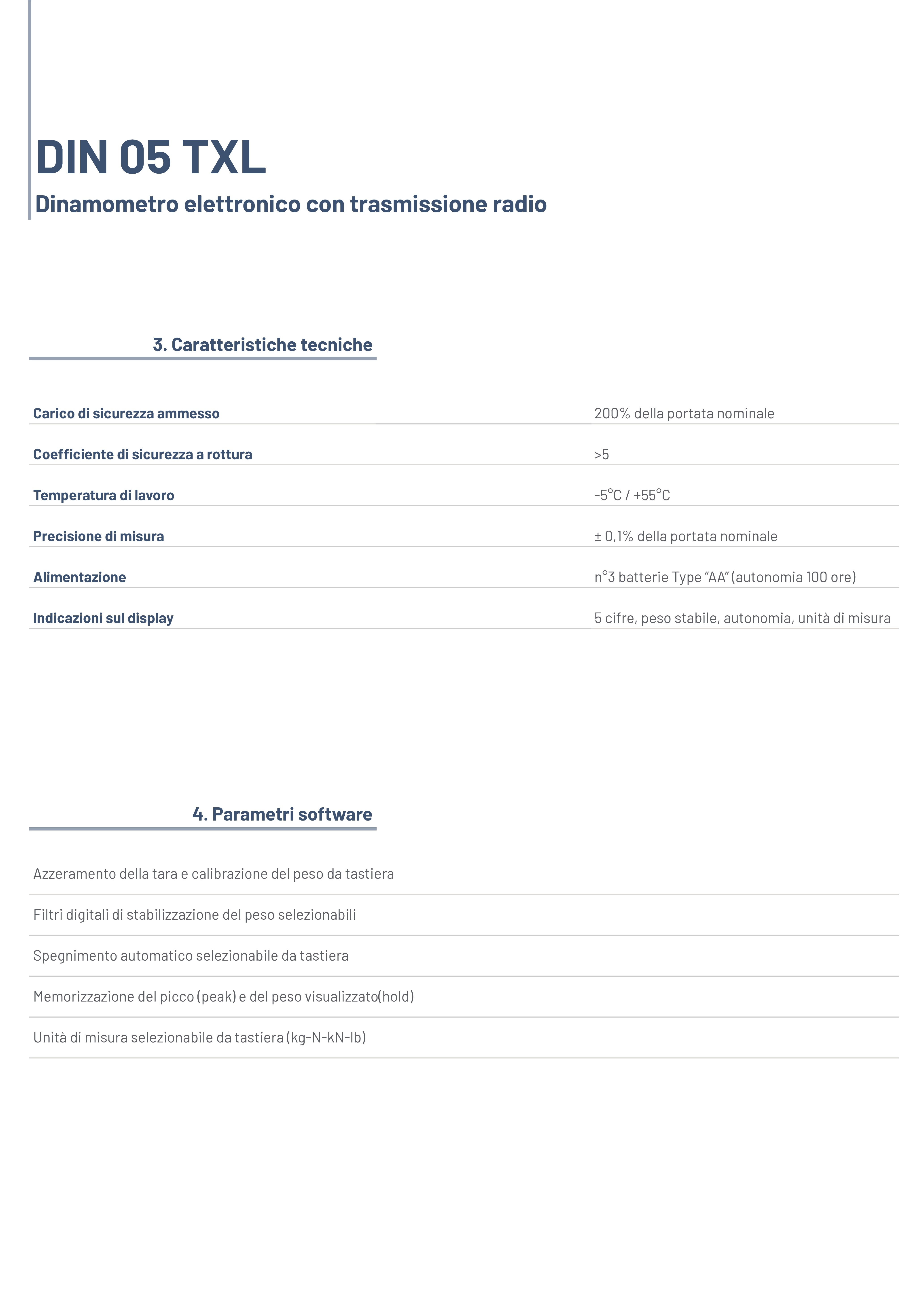 electronic dynamometer composed by a stainless steel traction load cell and an aluminium housing where is placed an electronic with a liquid crystal display 5 digit h=2,5, designed for weighing suspended loads with radio transmission to the hand receiver instrument model rx di02 or rx02 port with transmission frequencies 868 mhz up to a distance of 50 meters . functions are provided for: digital zero and weight settings, digital filter selection (greater attenuation of weight oscillations), automatic power-off selection, peak function and hold function and measuring units selection (kg – n – kn - lb).