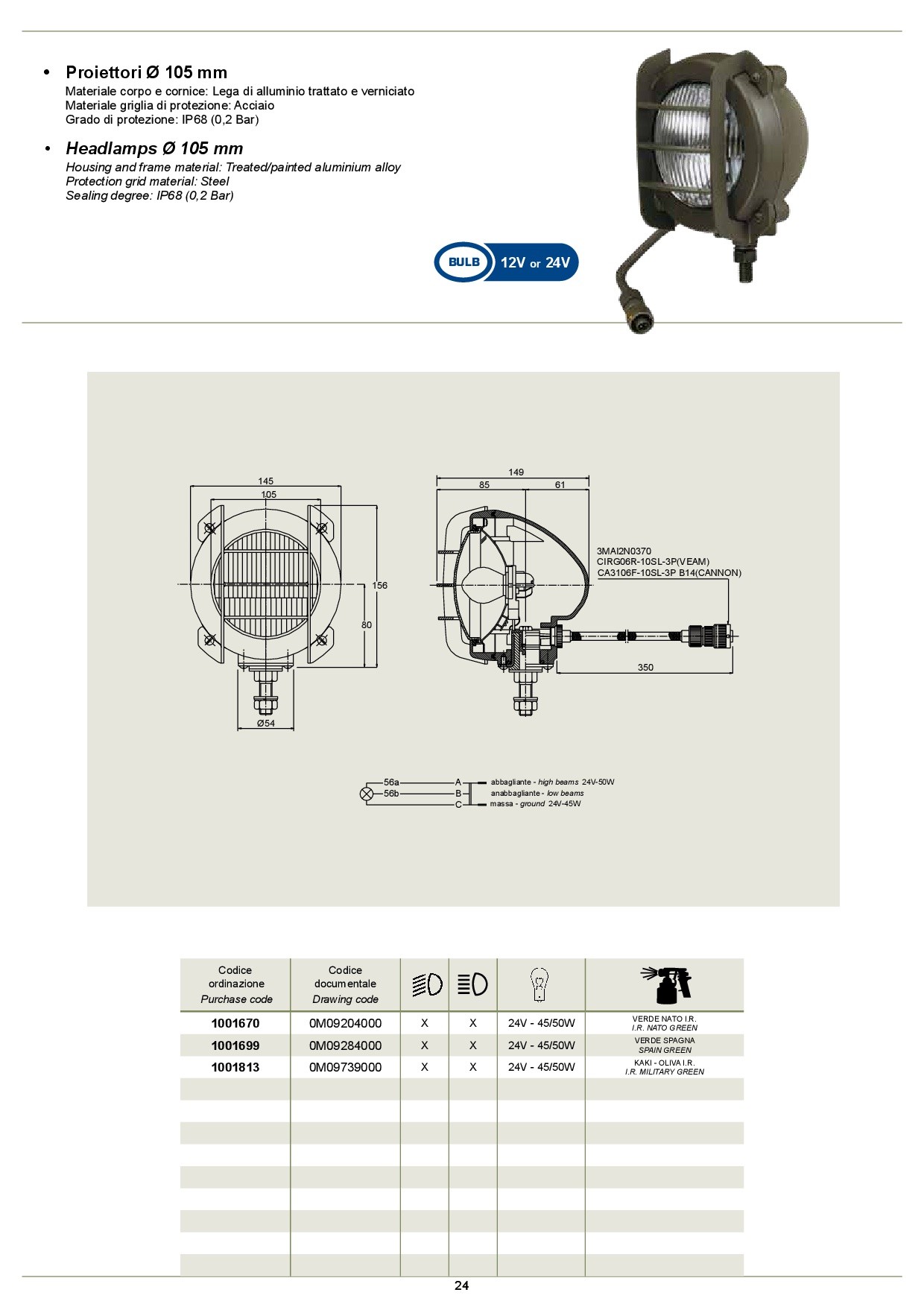 -drawing code 0m09204000, purchase code 1001670, low beams, headlamps, bulb 24v - 45/50w, colour i.r. nato green
