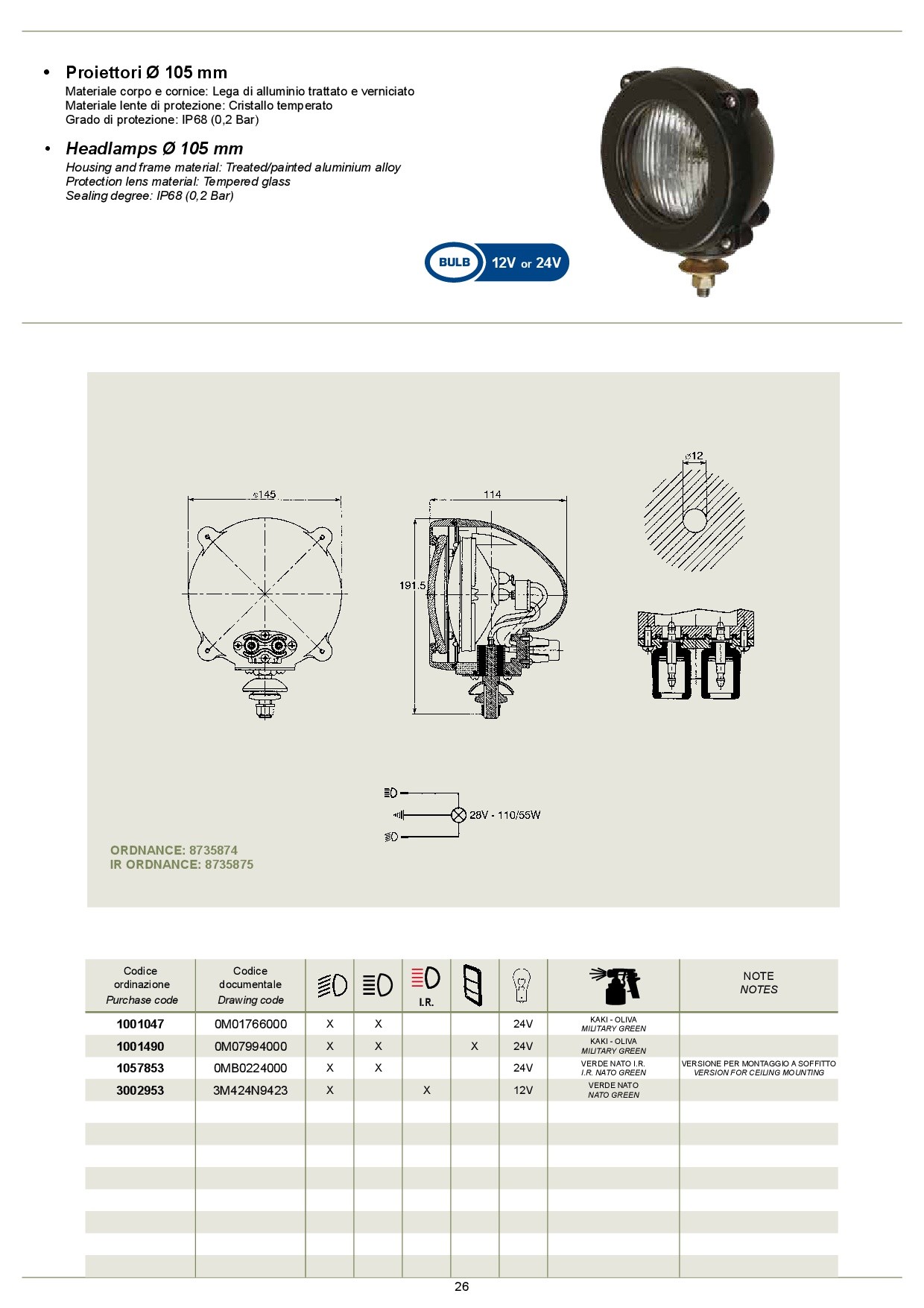 -drawing code 0mb0224000, purchase code 1057853, low beams, headlamps, bulb 24v, colour i.r. nato green, version for ceiling mounting