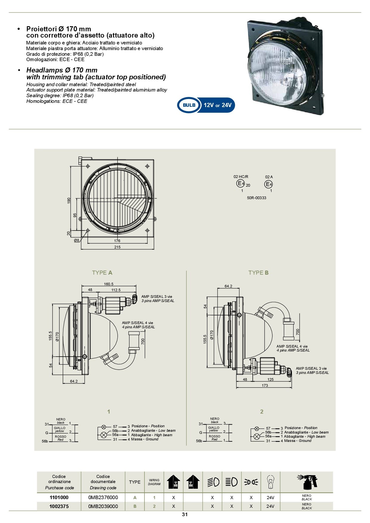 HEADLAMPS 170 MM WITH TRIMMING TAB (ACTUATOR TOP POSITIONED)