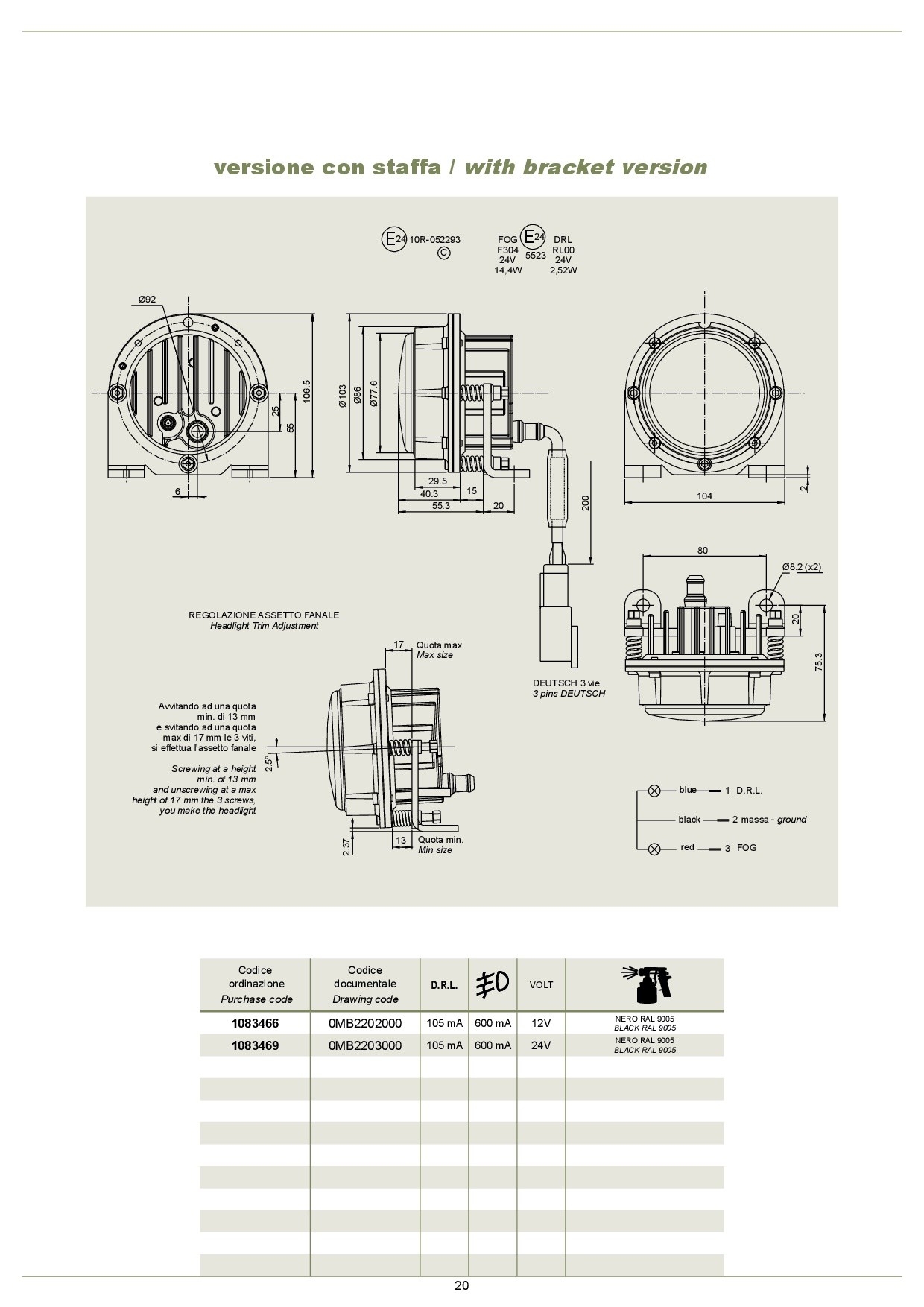 - drawing code 0mb2203000, purchase code 1083469, d.r.l. 105ma, fog light 600 ma, volt 24v, colour black ral 9005