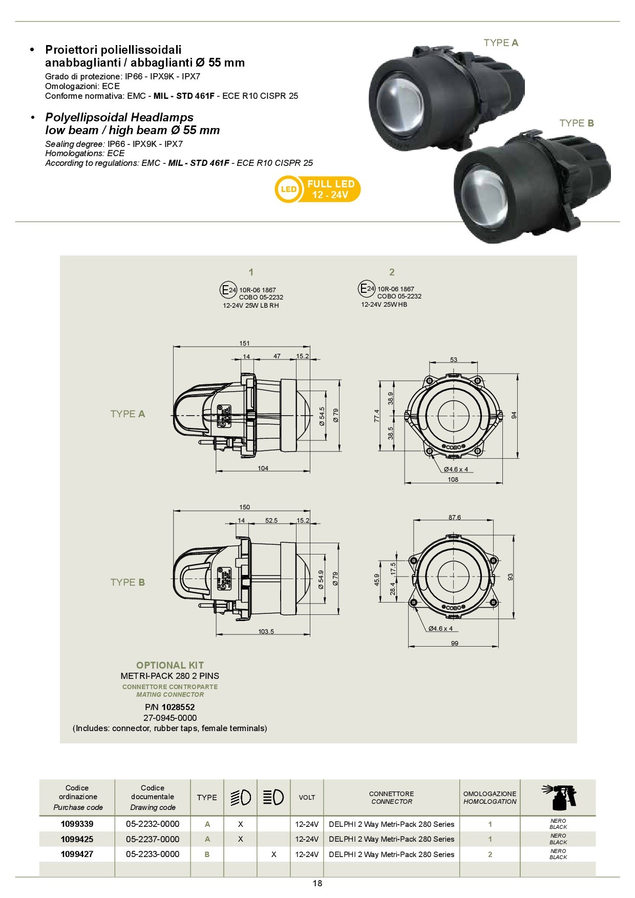 -drawing code 05-2232-0000, purchase code 1099339, type a, low beams, bulb 12/24v - connector 2 way metri-pack 280 series, homologation 1, color nero