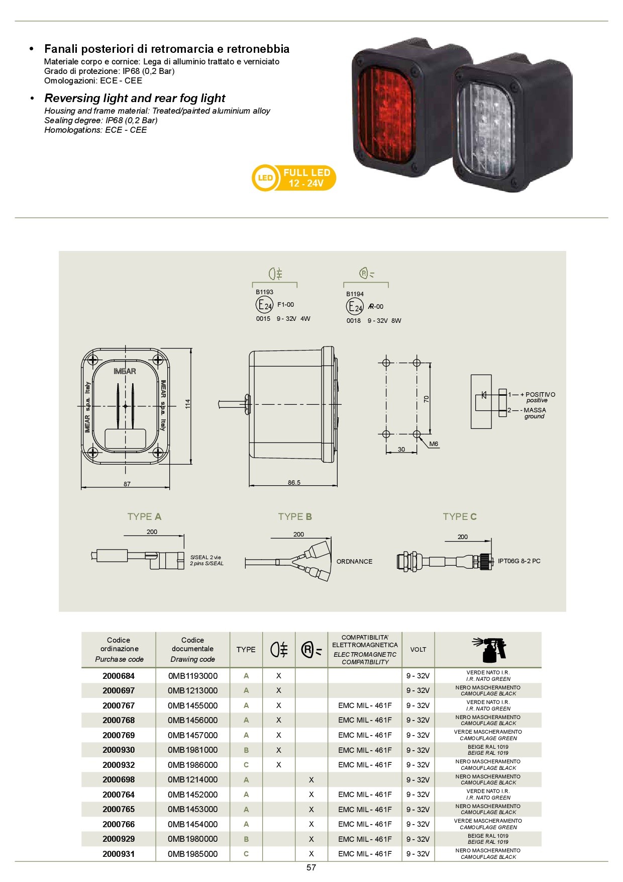 -drawing code 0mb1452000, purchase code 2000764, type a, reversing light, electromagnetic compatibility emc mil - 461f, volt 9 - 32v, colour i.r. nato green