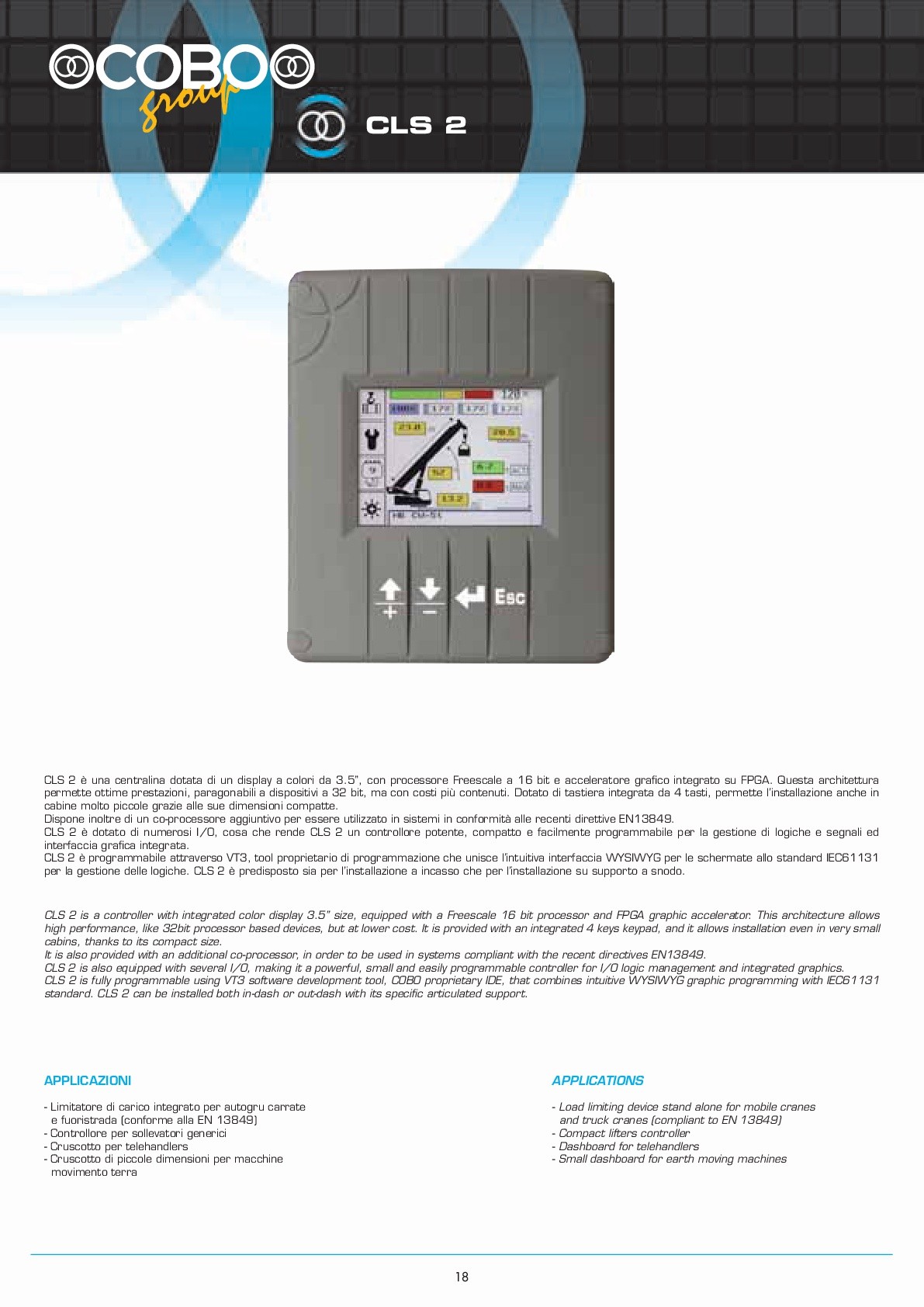 cls 2 is fully programmable using vt3 software development tool, cobo proprietary ide, that combines intuitive wysiwyg graphic programming with iec61131 standard. cls 2 can be installed both in-dash or out-dash with its specific articulated support.
