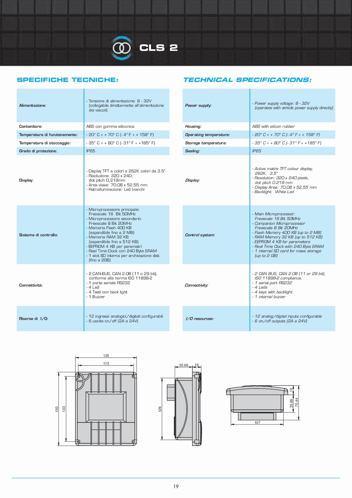 description cls 2 is a controller with integrated color display 3.5" size, equipped with a freescale 16 bit processor and fpga graphic accelerator. this architecture allows high performance, like 32bit processor based devices, but at lower cost. it is provided with an integrated 4 keys keypad, and it allows installation even in very small cabins, thanks to its compact size.