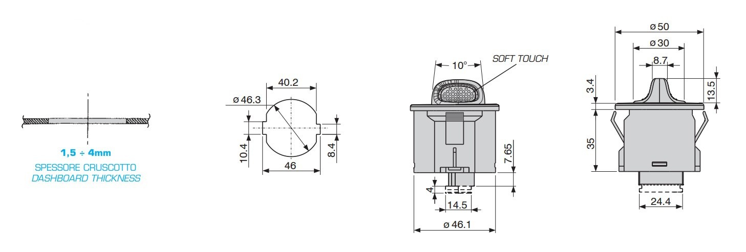 description pc housing - pc/abs + gf knob soft touch - pa + gf terminal board with 6 ways mqs amp integrated connector suitable for mqs 50402 3024dc male connector - white colour laser engraved icons lighted by green colour high intensity led - white