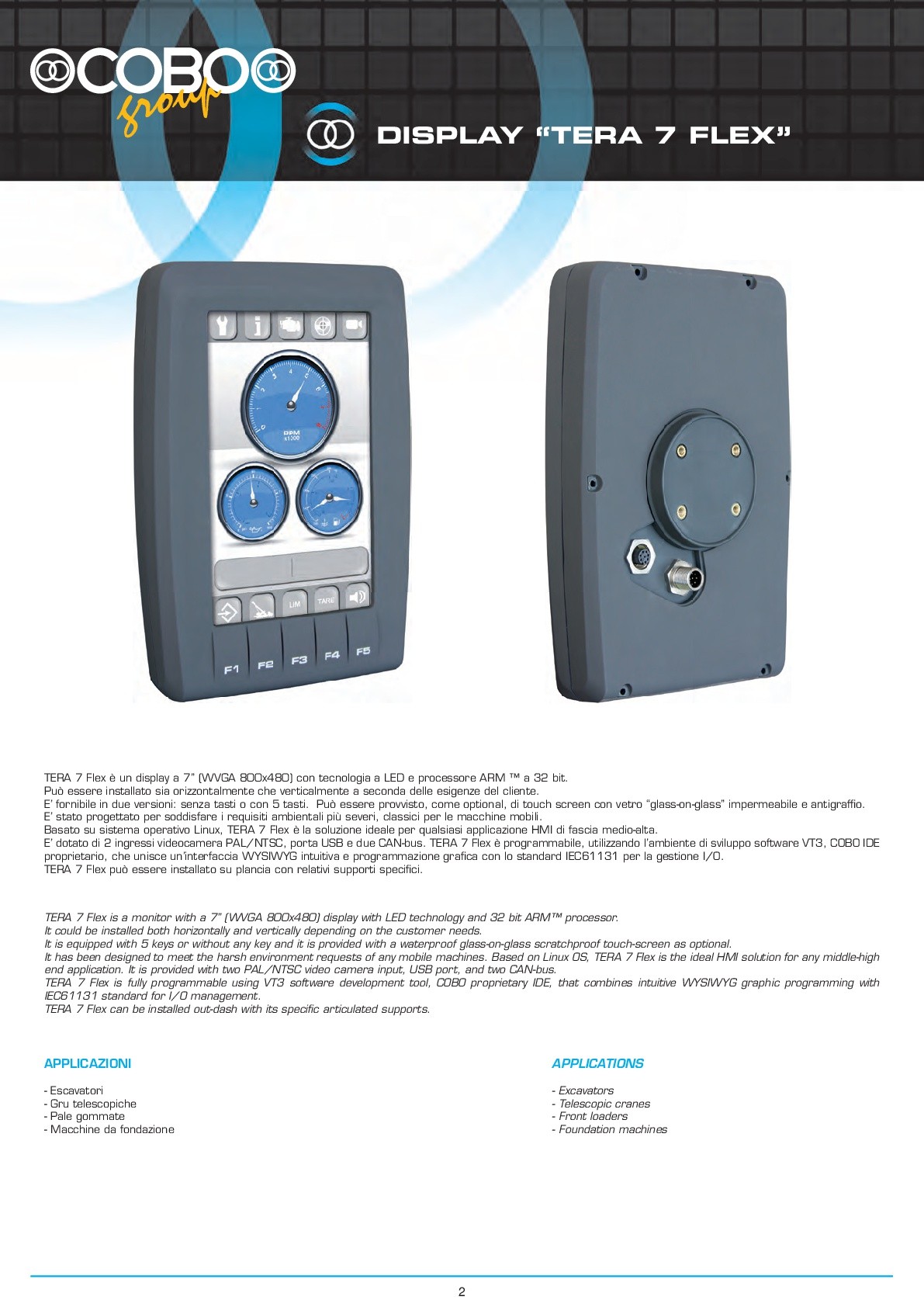it could be installed both horizontally and vertically depending on the customer needs. it is equipped with 5 keys or without any key and it is provided with a waterproof glass-on-glass scratchproof touch-screen as optional. it has been designed to meet the harsh environment requests of any mobile machines. based on linux os, tera 7" flex is the ideal hmi solution for any middle-high end application. it is provided with two pal/ntsc video camera input, usb port, and two can-bus.
