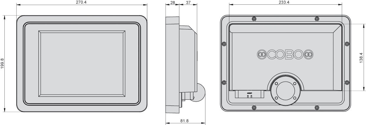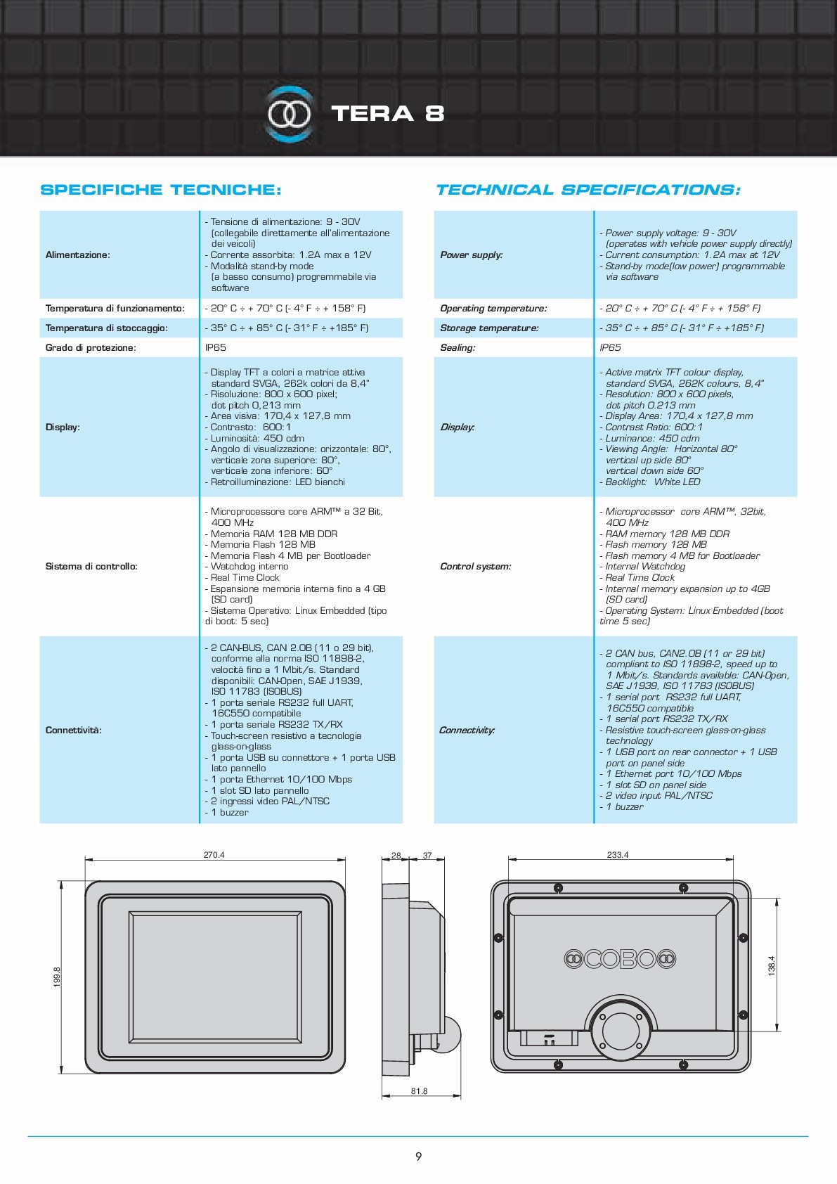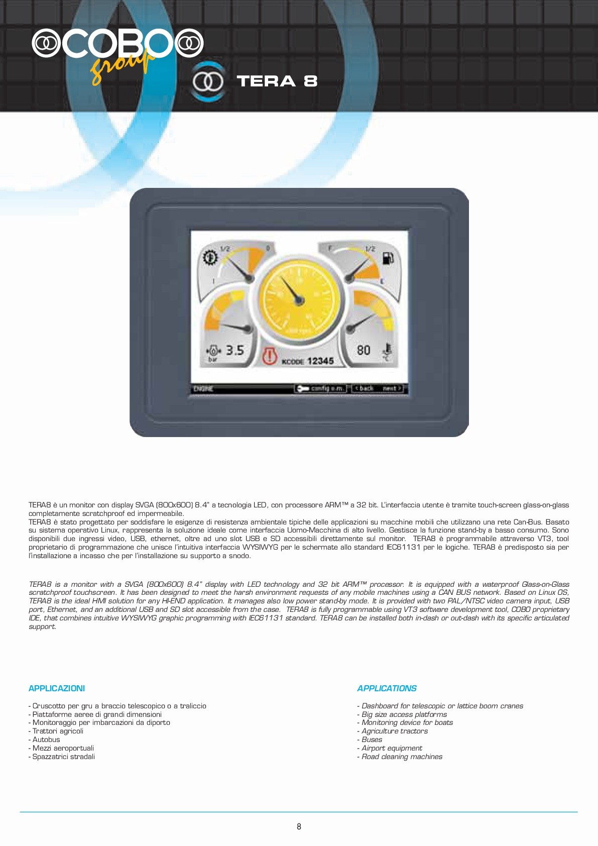 description tera 8 is a monitor with a svga (800x600) 8.4" display with led technology and 32 bit arm processor. it is equipped with a waterproof glass-on-glass scratchproof touchscreen. it has been designed to meet the harsh environment requests of any mobile machines using a can bus network. based on linux os, tera8 is the ideal hmi solution for any hi-end application. it manages also low power stand-by mode. it is provided with two pal/ntsc video camera input, usb port, ethernet, and an additional usb and sd slot accessible from the . tera8 is fully programmable using vt3 software development tool, cobo proprietary ide, that combines intuitive wysiwyg graphic programming with iec61131 standard. tera8 can be installed both in-dash or out-dash with its specific articulated support.