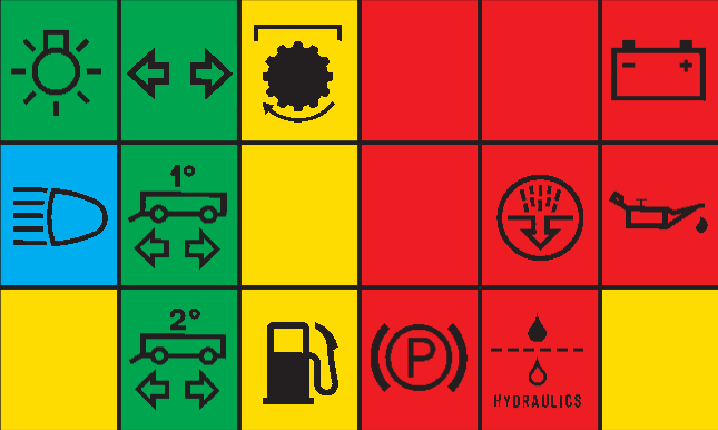 2nd trailers turn signal - fuel reserve - hand brake on - hydraulic oil filter - neutral