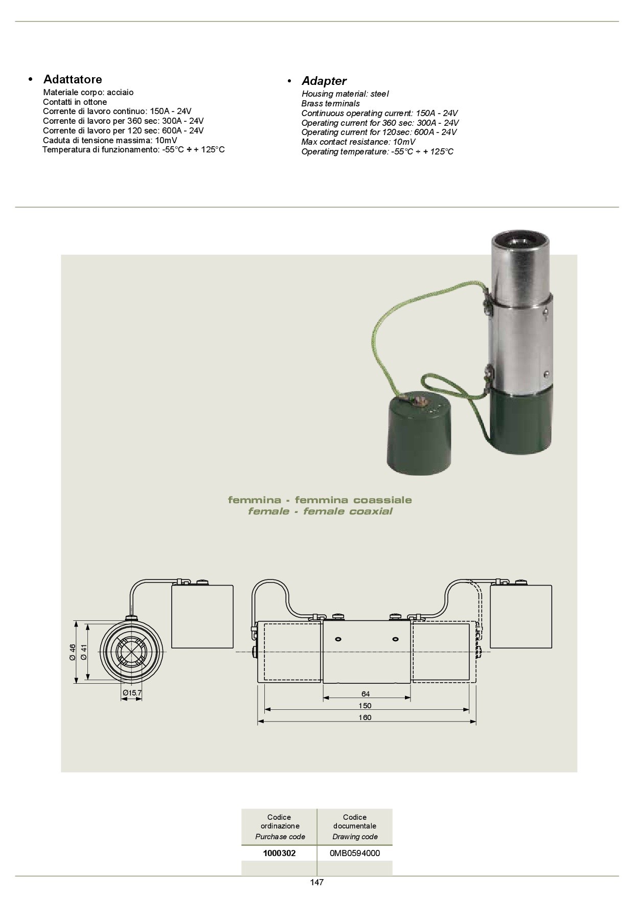 contatti: ottone corrente di lavoro continuo: 150a - 24v corrente di lavoro per 360 sec: 300a - 24v corrente di lavoro per 120 sec: 600a - 24v caduta di tensione massima: 10mv temperatura di funzionamento: -55°c ÷ + 125°c