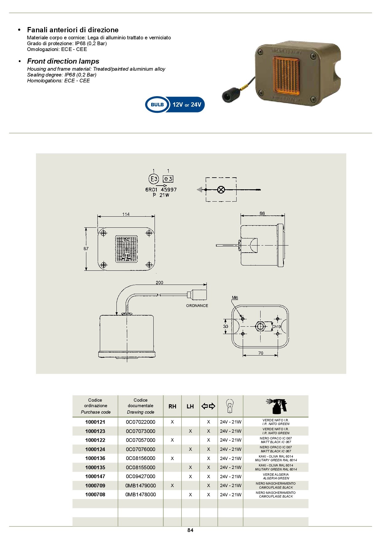 -cod.documentale 0c08155000, codice ordinazione 1000135, lh, direzione, lampada 24v - 21w, colore kaki - oliva ral 6014