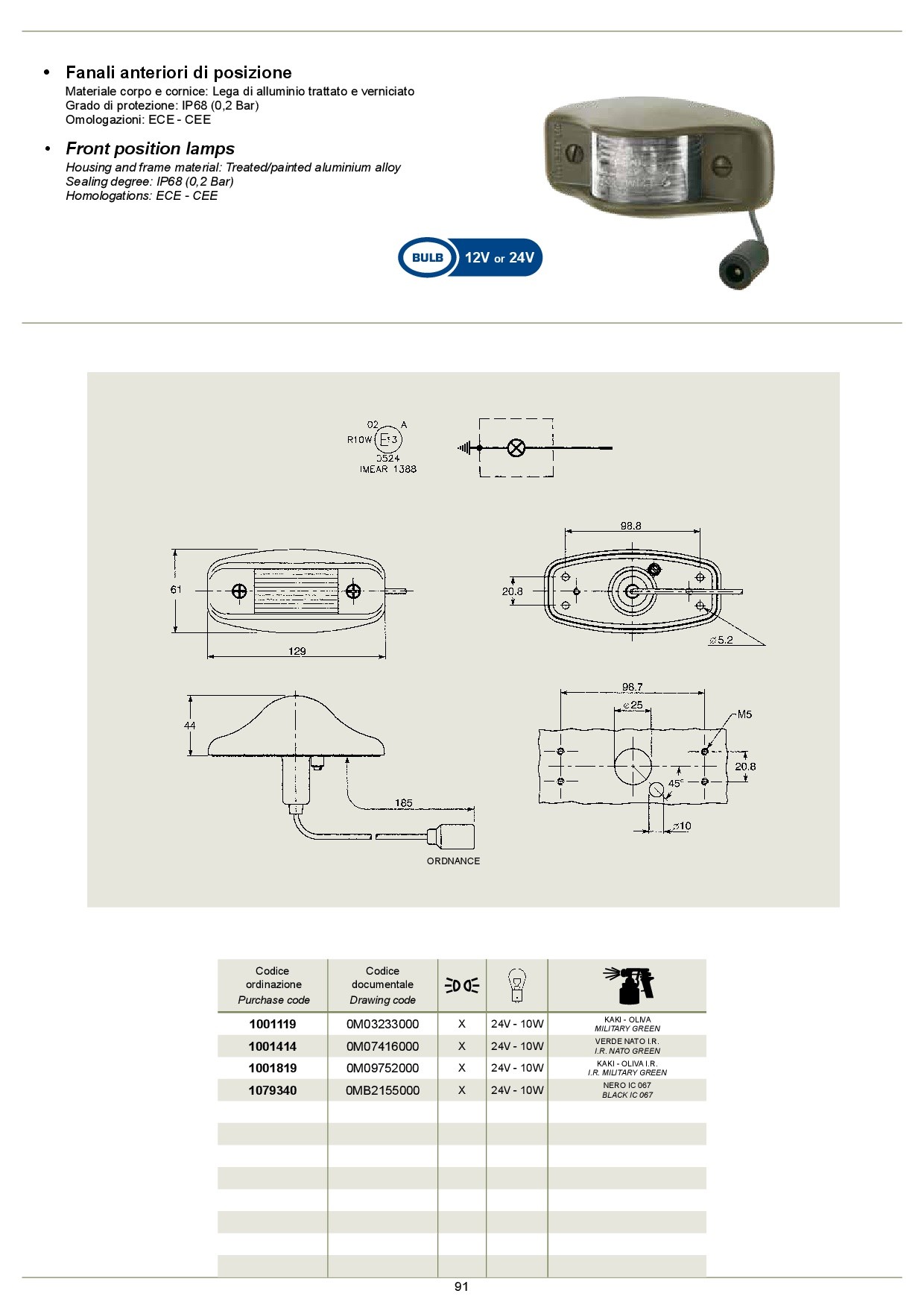 -cod.documentale 0m09752000, codice ordinazione 1001819, posizione, lampada 24v - 10w, colore kaki - oliva