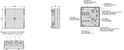 il modulo base permette di distribuire la tensione della batteria nei vari rami del circuito. e possibile connettere in parallelo n°2 cavi di sezione max 50 mmq (a e b) e di avere due uscite protette da fusibile; una (c) con rotezione da 40-250a (fusibile tipo mega) e laltra (d) da 30-100a (fusibile tipo ).