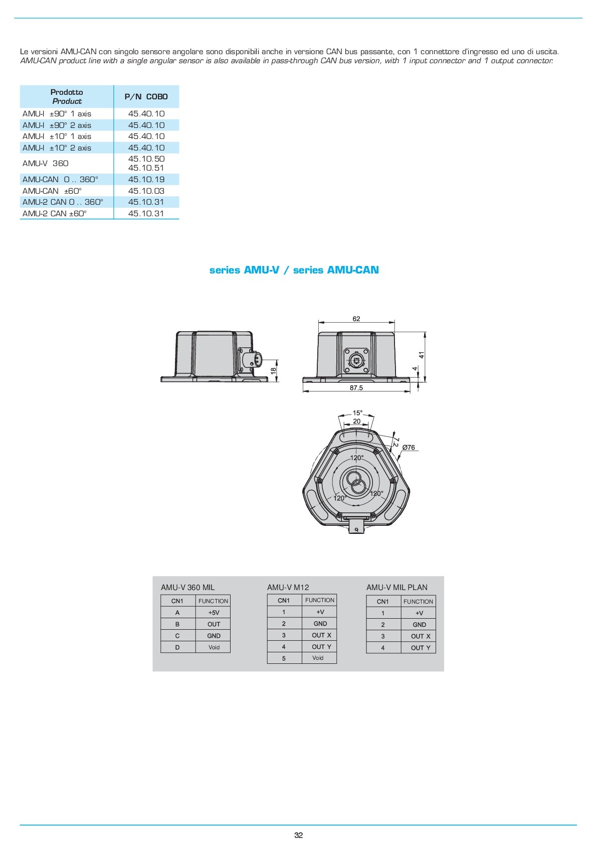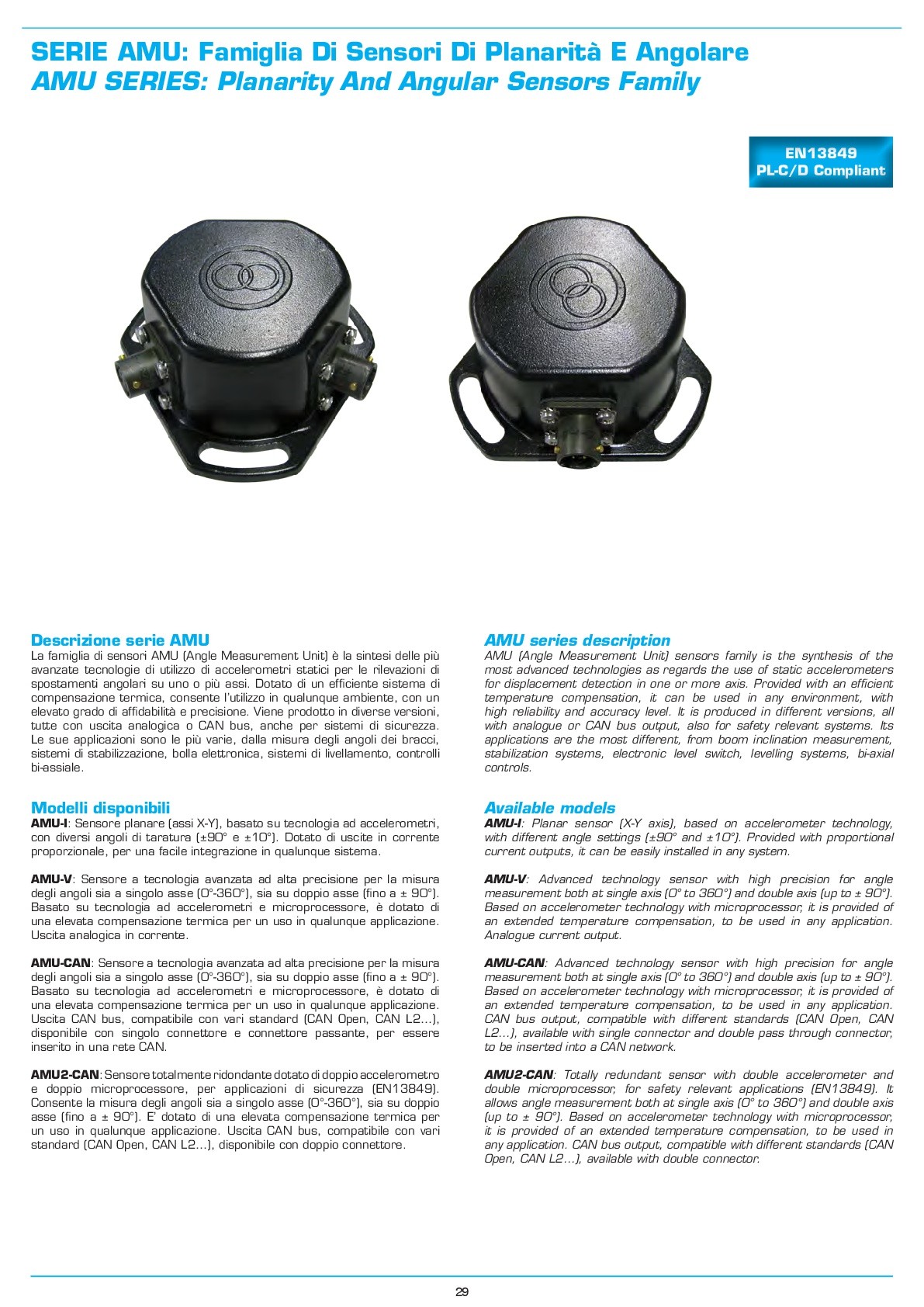 amu-i: sensore planare (assi x-y), basato su tecnologia ad accelerometri, con diversi angoli di taratura (±90° e ±10°). dotato di uscite in corrente proporzionale, per una facile integrazione in qualunque sistema.