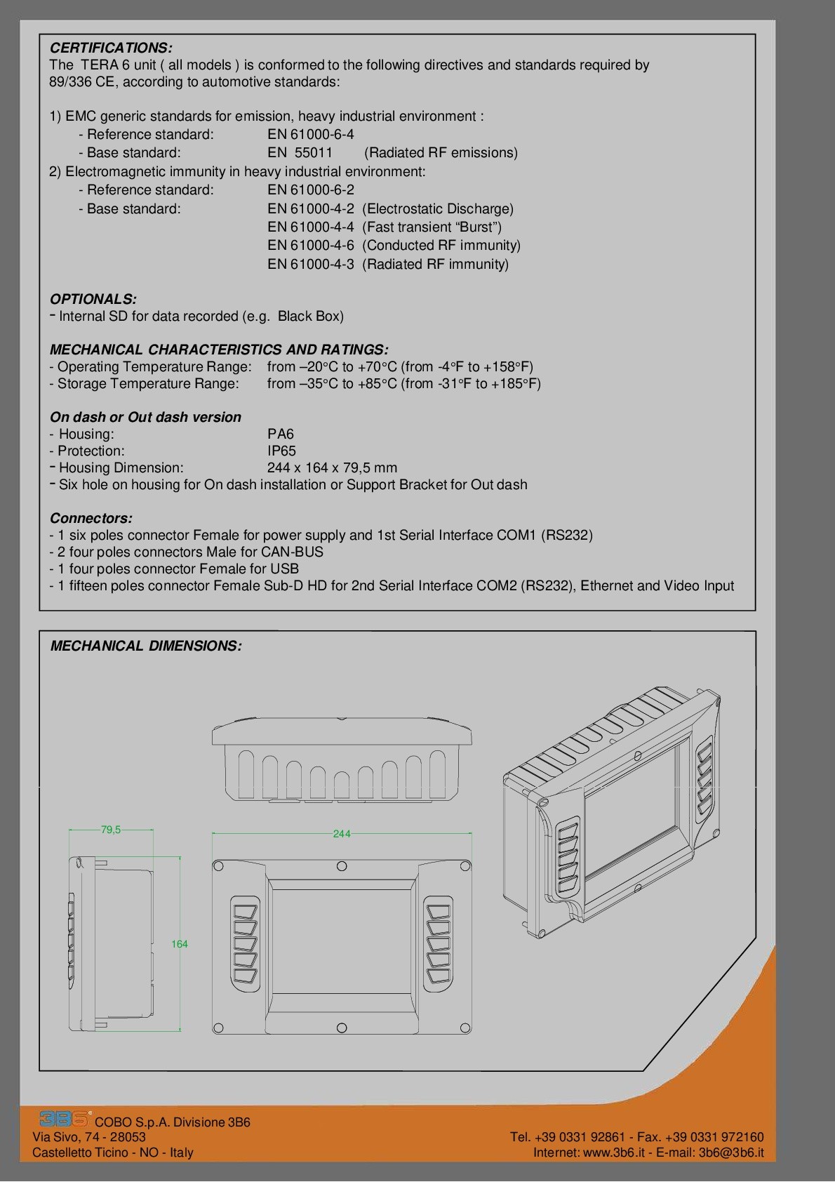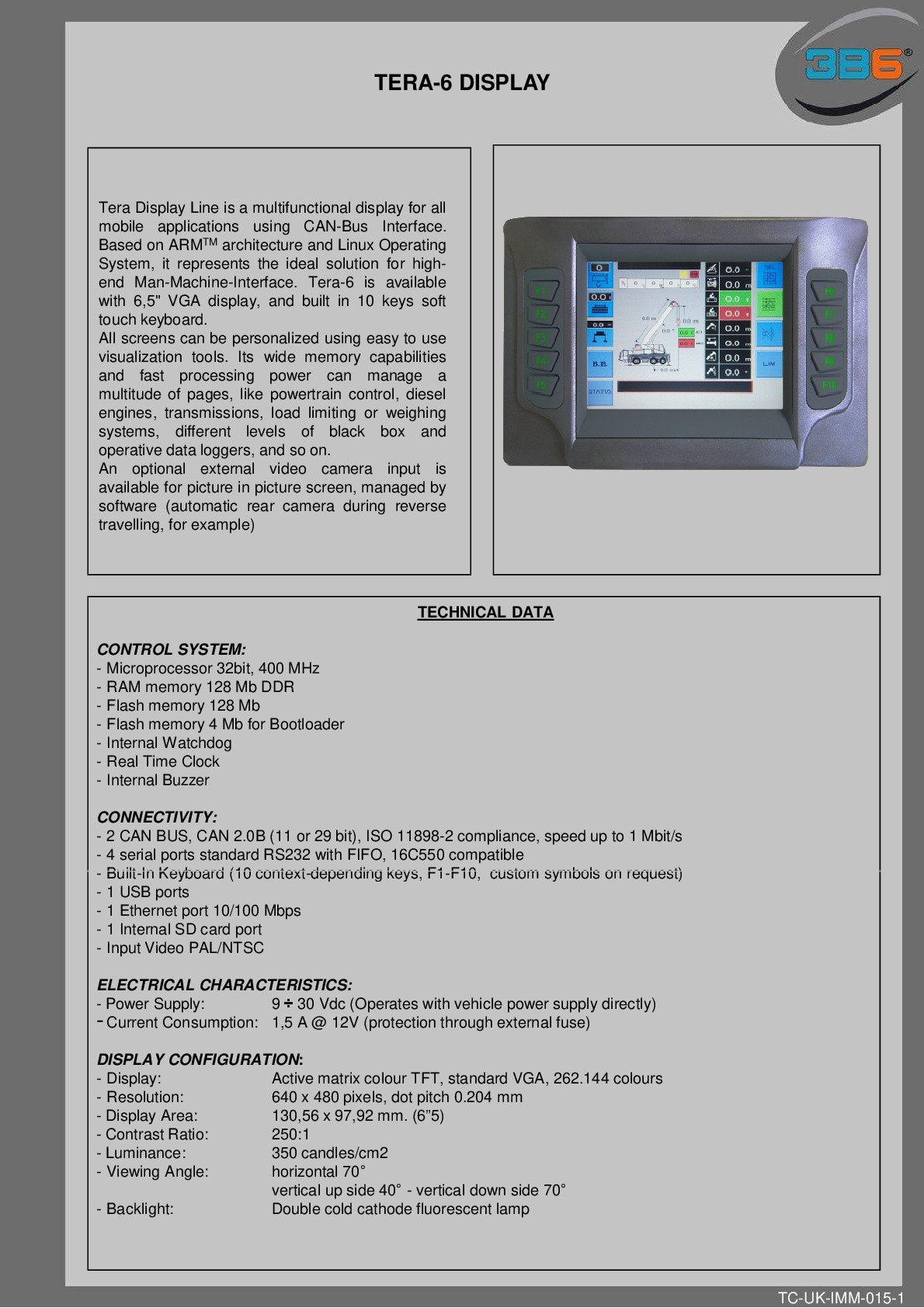 descrizione tera6 è un monitor con display vga (640x480) da 6.5” a tecnologia led, con processore arm™ a 32 bit. l’interfaccia utente è tramite tastiera integrata da 10 tasti.
